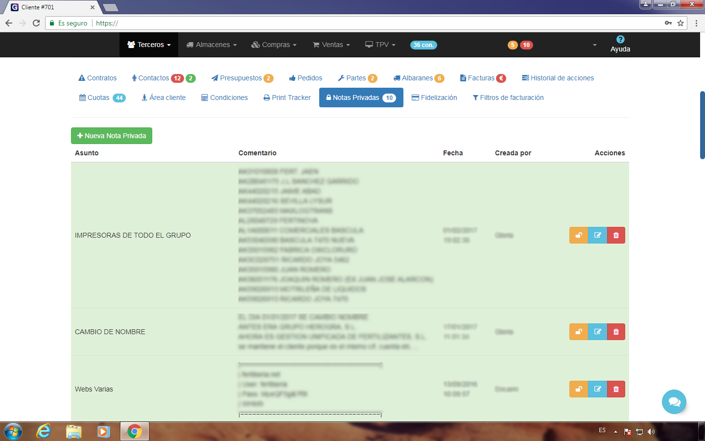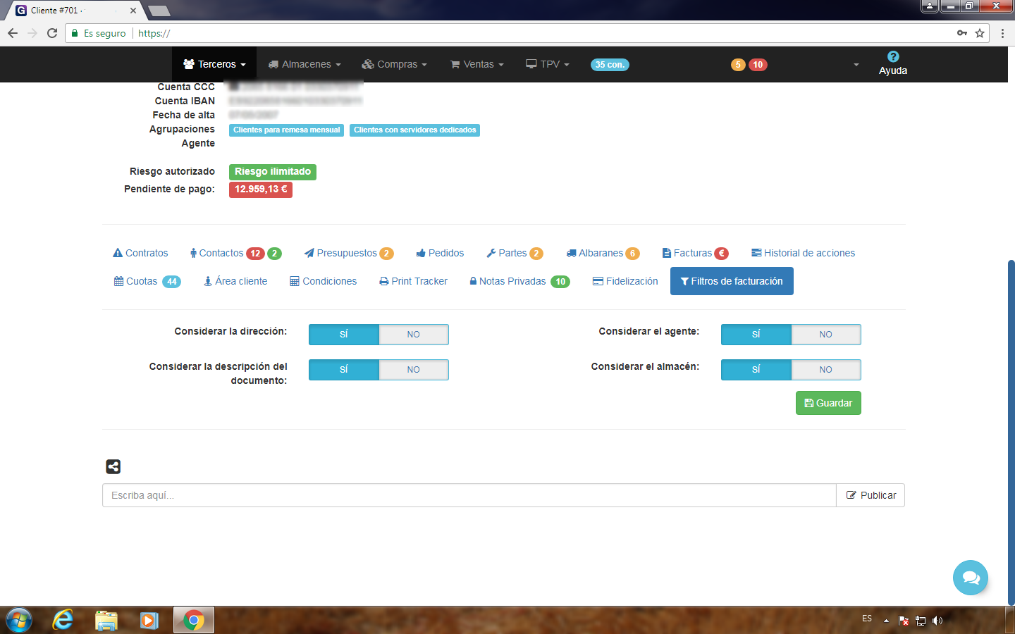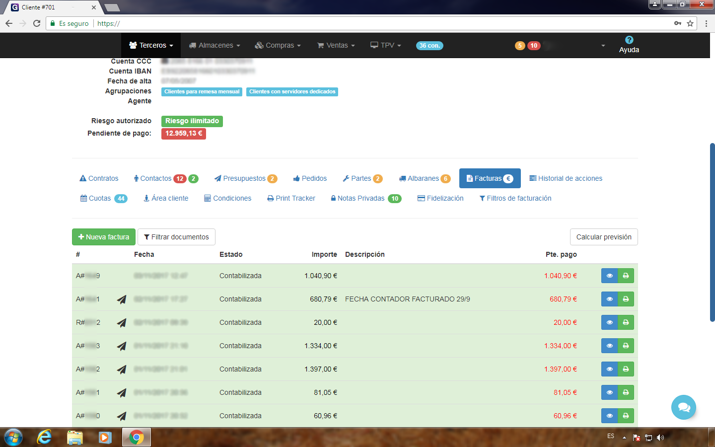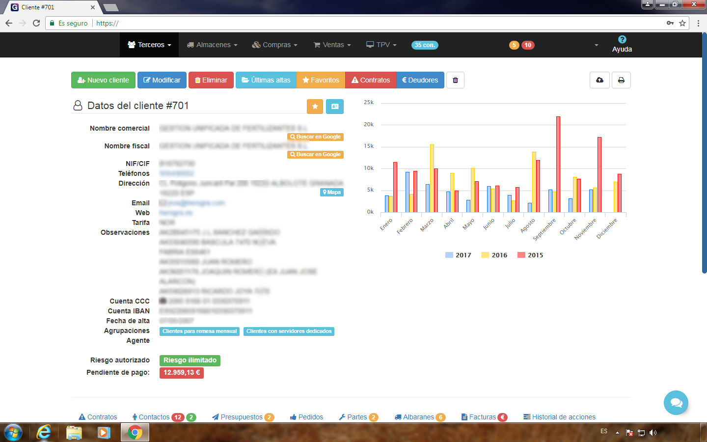 La parte del programa donde se visualizan los clientes, consideramos que es el corazón de un ERP desde dicha ventana usted tendrán toda la información relativa a los mismos, podrá marcar aquellos clientes con los que trabaje como favoritos de manera que dispondrá de un filtro rápido del grupo de clientes con los que este trabajando.
