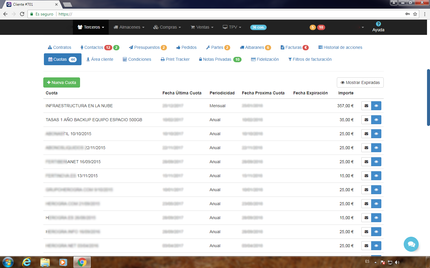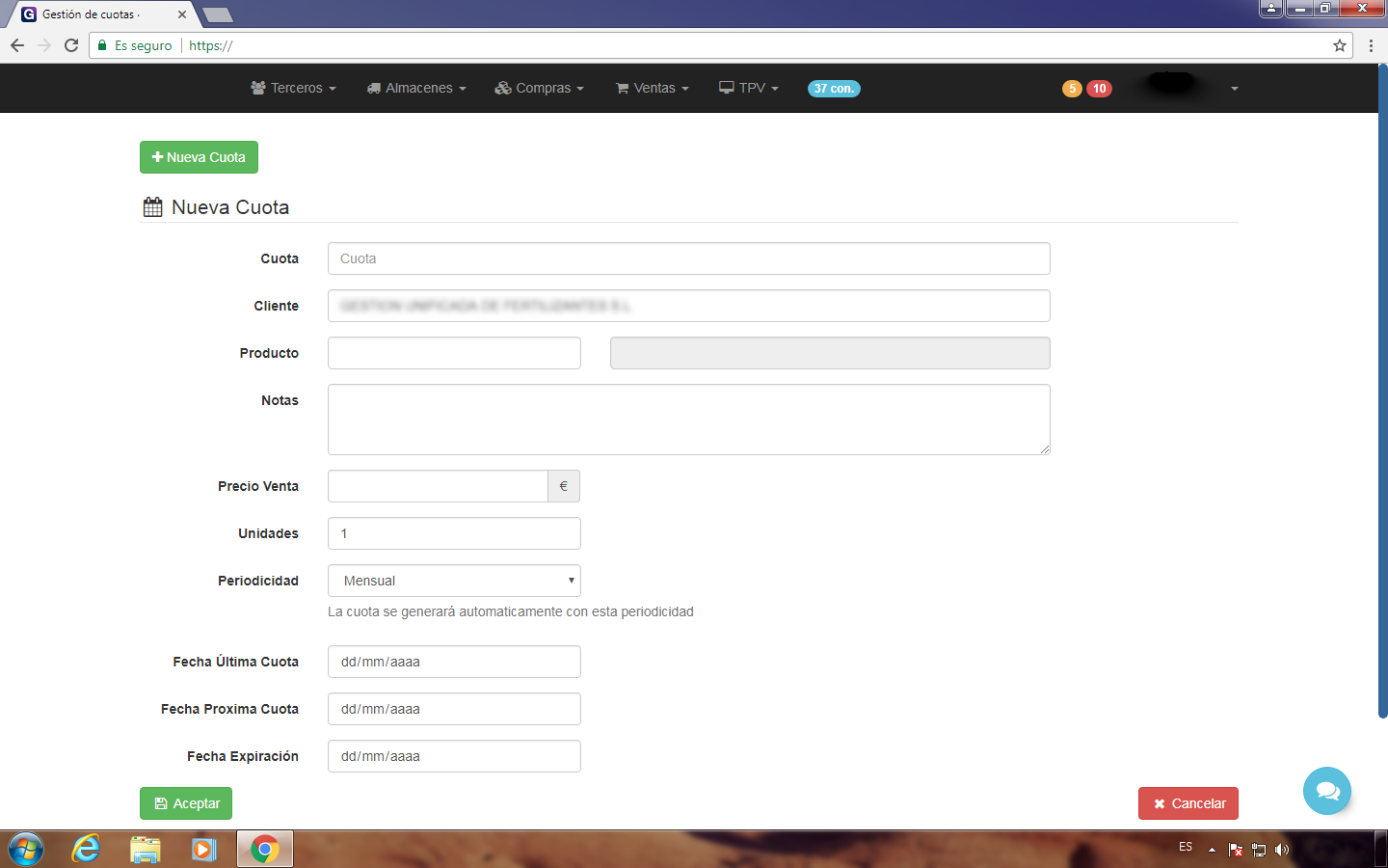 Nuestro software permite crear diferentes cuotas a un cliente. Por ejemplo, una cuota de mantenimiento se le indica la periodicidad (mensual, trimestral, anual) que usted quiera y se generarán automáticamente cuando llegue el día. Usted solo tendrá que marcar las que quiera generar en una factura.