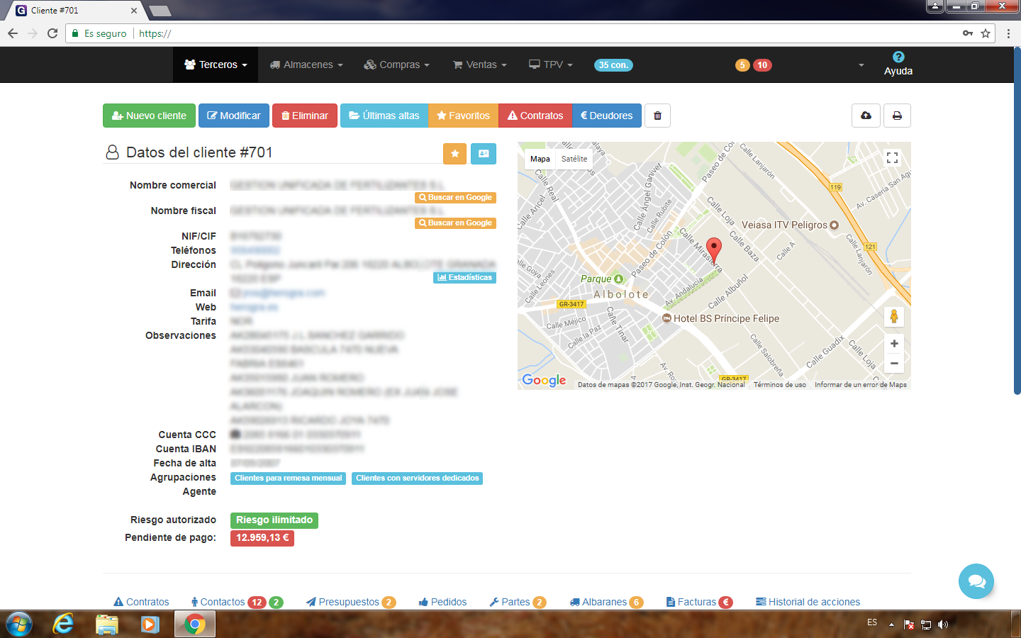 Puede ver la ubicación exacta de su cliente pulsando sobre Maps, en función de los datos que tenga en su ficha.