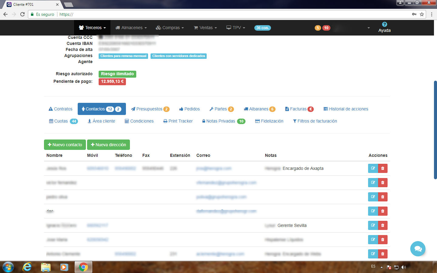 Podemos tener todas las personas que trabajan en una empresa dentro de la pestaña contactos. Así podremos saber a quien dirigirnos cuando se trate de un tema financiero, o de almacén etc.
