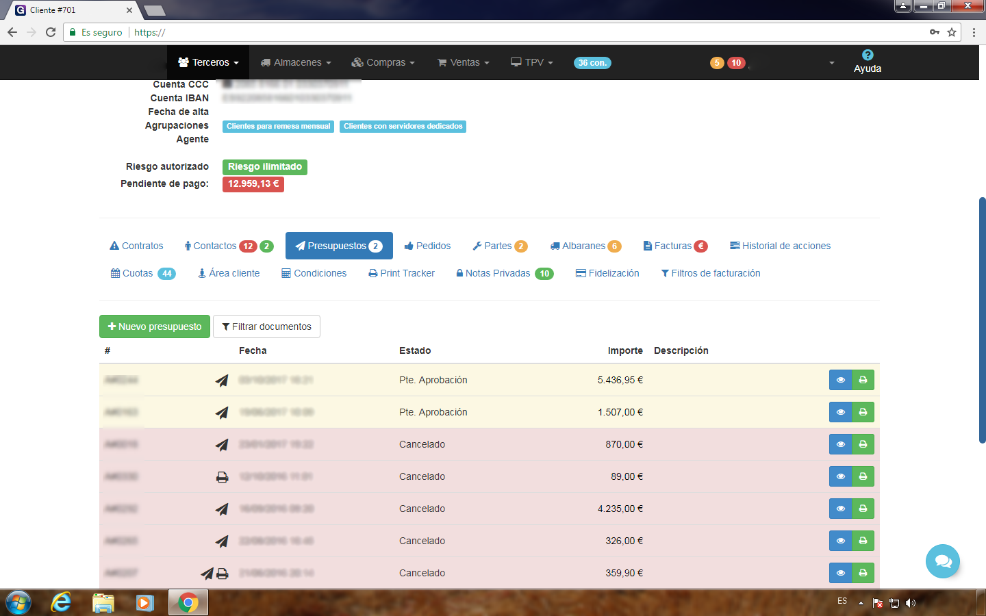 Todos los presupuestos de tu cliente filtrados y disponibles. También puedes crear uno nuevo desde aquí, imprimir o enviar por correo electrónico a tu cliente o a quien quieras.