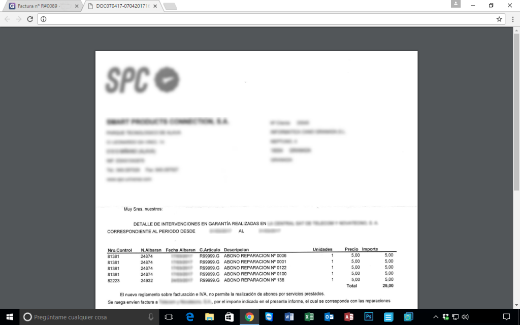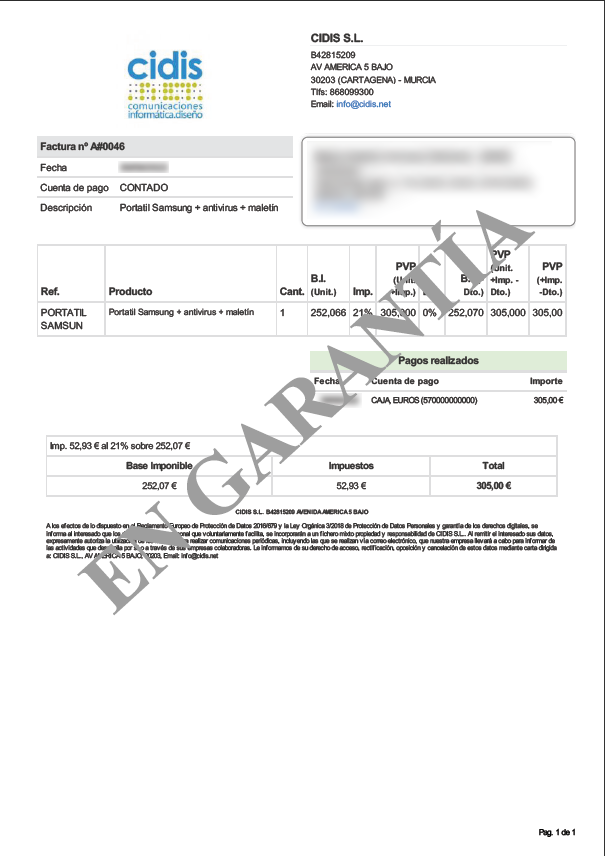 Nuestro sistema le enviara una factura a coste 0 con marca de agua indicando que se trata de garantía pero con el importe de la misma.